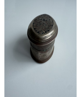 2.000,00 krSehr alte Kupferdose zur Aufbewahrung von zerstoßenem, getrocknetem Limettenpulver. Ein Muster auf dem Deckel und am Boden ein Fisch. Saubere Seiten aus reinem Kupfer. Reste von getrocknetem Limettenpulver im Inneren. Im Vergleich zum Alter ist sie in einem guten Zustand mit nur einem kleinen Loch im Boden. Gewicht 160 Gramm.