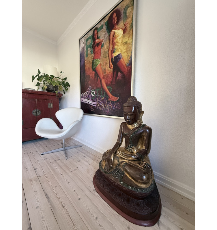 Sehr großer und außergewöhnlich gut erhaltener Mandalay Buddha aus Lack, sitzend auf einem klassischen Lotusthron. Die Figur erscheint in bräunlichen und vergoldeten Nuancen in der traditionellen "calling earth to witness" Haltung.