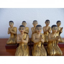 Die Geschichte der Mönche und Jünger ist so alt wie der Buddha. Ähnlich wie der Buddha werden sie auch aus vielen verschiedenen Materialien gefertigt, von Bronze, Holz, Lack bis Elfenbein, und sie werden normalerweise paarweise oder als Teil einer größeren Statue gefunden, bei der der Buddha im Zentrum steht und die Mönche an der Basis dargestellt sind, um Respekt zu zollen. Im Laufe der Geschichte haben einige Mönche Berühmtheit erlangt, und die Statue wird den Namen des Mönchs tragen. Mönche zeigen normalerweise einen demütigen Ausdruck und die Handwerkskunst ist exquisit, einige mit Perlmuttaugen und -nägeln. Aufgrund ihrer Seltenheit sind antike Mönche heute Objekte, die von anspruchsvollen Sammlern hoch geschätzt werden.