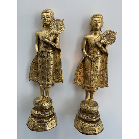 Ein Paar vergoldete Mönche, die einen Fächer halten. Letzterer ist sehr selten. In gutem Zustand. Bangkok-Periode.