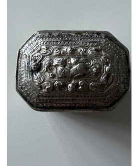 1.500,00 krOctagonal smaller silver box with a Liondog on the lid surrounded by flowers. Also flower pattern on the sides. In a very good condition. Weight 71 gram.