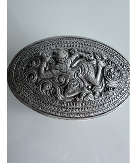 High end silver box (food tiffin) with an Liondog on the lid and various animals (Zodiacs) on the sides. A peacock on the underside of the box. In a very good condition. Rare piece. Weight 237 gram.
