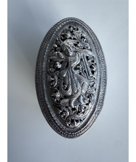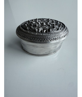 Seltene ovale Silberdose mit einer königlichen Person auf dem durchbrochenen Deckel. Umgeben von einem Blumenmuster. Glatte Seiten. Gewicht 140 Gramm. In sehr gutem Zustand.