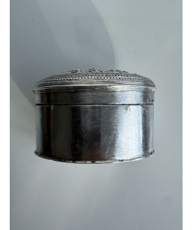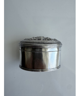 Kleine silberne Limettenbox mit einem Hochrelief-Blumenmuster auf dem Deckel. Glatte Seiten und Boden. Ein Band trennt den Deckel und endet die Box. Gewicht 59 Gramm.