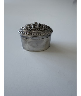 Kleinere ovale Silber-Limebox mit einem sehr schönen Blumenmuster auf dem Deckel. Glatte Seiten und Boden. Gewicht 65 Gramm.