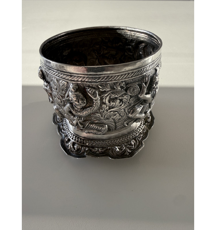 Eine ältere, schön gearbeitete und sehr detaillierte Schale auf einem kleinen Sockel aus Burma. Die Seiten sind mit sechs klar abgegrenzten Szenen mit Tänzerinnen verziert, die von Blättermotiven umrahmt werden und der Schale eine elegante und lebendige Wirkung verleihen. Der sehr gute Zustand und die ausgewogene Form unterstreichen die hohe handwerkliche Qualität. In sehr gutem Zustand. Gewicht: 91 Gramm.