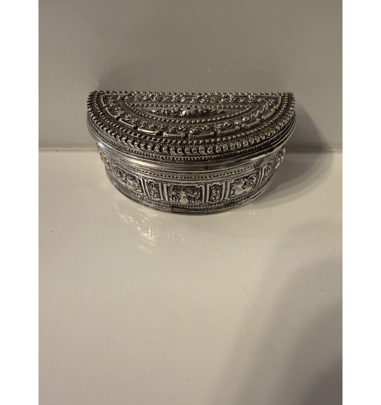 Alte handgefertigte halbmondförmige Silberdose aus Burma mit floralem Muster auf dem Deckel.