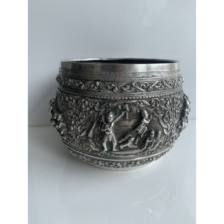 Antike handgefertigte Silberschale aus Burma mit fünf detailreichen Szenen entlang der Seiten im Hochrelief ausgeführt.