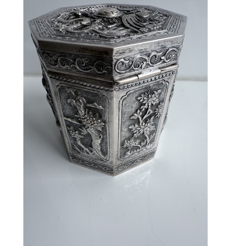 Achteckige Silberdose mit einem reich verzierten Deckel. Oben ein Drache und ein Kranich und an den 8 Seiten, auf einem durchbrochenen Hintergrund, sehr detaillierte Blumen- und Baumotive. Eine Markierung befindet sich auf der Unterseite der Dose. Gewicht 150 Gramm.