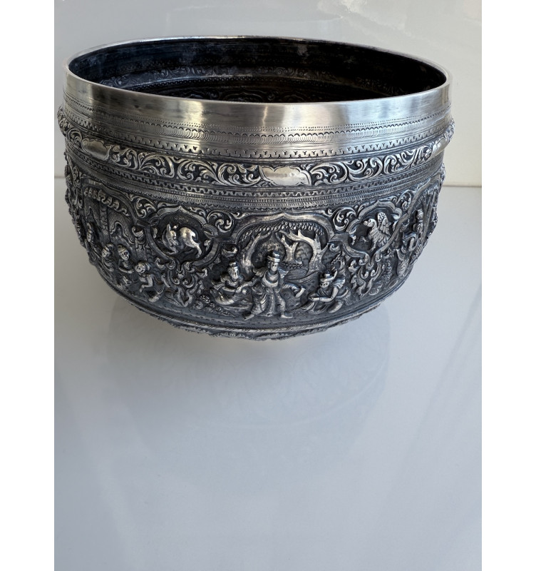 Eine sehr große, prächtige alte Schale mit Szenen aus dem königlichen Leben und einigen Fabeltieren an den Seiten. Alle Szenen sind sehr detailliert in hohem Relief mit einem großen Blattband darunter. In einem sehr guten Zustand. Gewicht 1217 Gramm.
