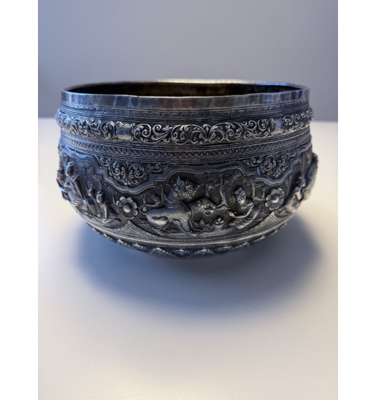 Eine Sehr grosse, Prachtvolle alte Schale mit sieben freistehenden Szenen aus dem königlichen Hof, die jeweils durch eine kleine Lotusblume voneinander getrennt sind. Alle Szenen sind detailreich im Hochrelief ausgeführten mit einem breiten Blattband am unteren Rand versehen. Von aussergewöhnlich hoher Qualität. Die Schale befindet sich in einem hervorragenden Zustand. Gewicht: 1200 Gramm.