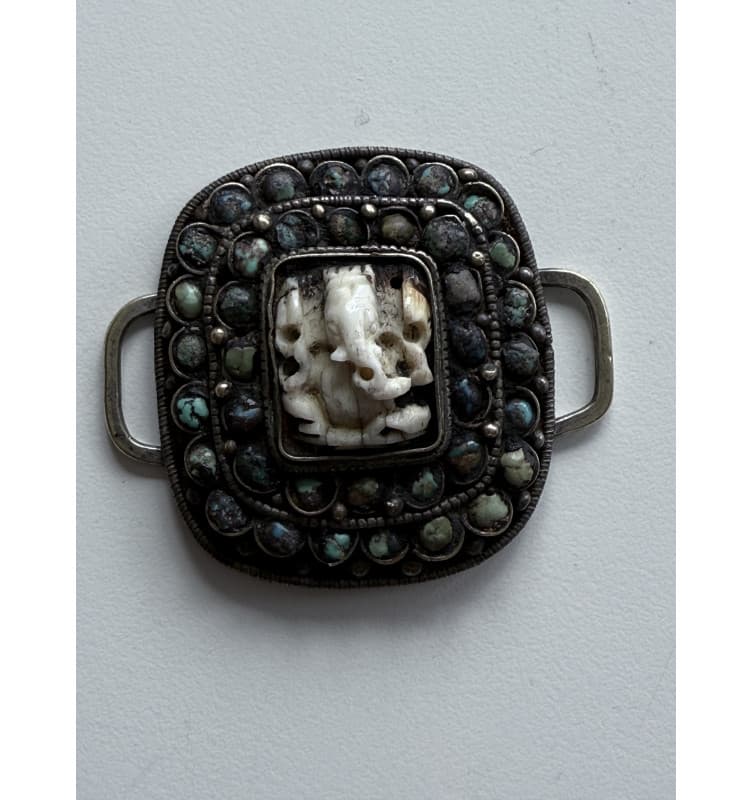 Schnalle mit Steineinlage und einem kleinen Ganesha aus Elfenbein (denke ich).