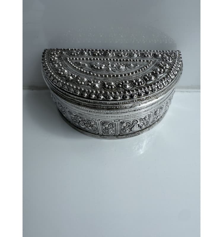 Alte Halbmond-Qualitätsbox mit einem detaillierten Blumenmuster auf dem Deckel und kleinen Vögeln an den Seiten bedeckt. Ein Datum/Name/Ort ist auf die Unterseite der Rückseite eingraviert. In einem guten Zustand. Gewicht 109 Gramm.
