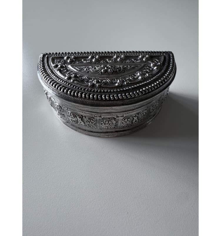Seltene Qualität Halbmond-Box, bedeckt mit einem detaillierten Blumenmuster auf dem Deckel und den Seiten. Hier sieht man auch kleine Vögel. Auf der Rückseite gibt es einen leeren Bereich, der für eine Inschrift vorbereitet ist. Ein Name/Datum ist auf der Unterseite eingraviert. In einem sehr guten Zustand. Gewicht 150 Gramm.