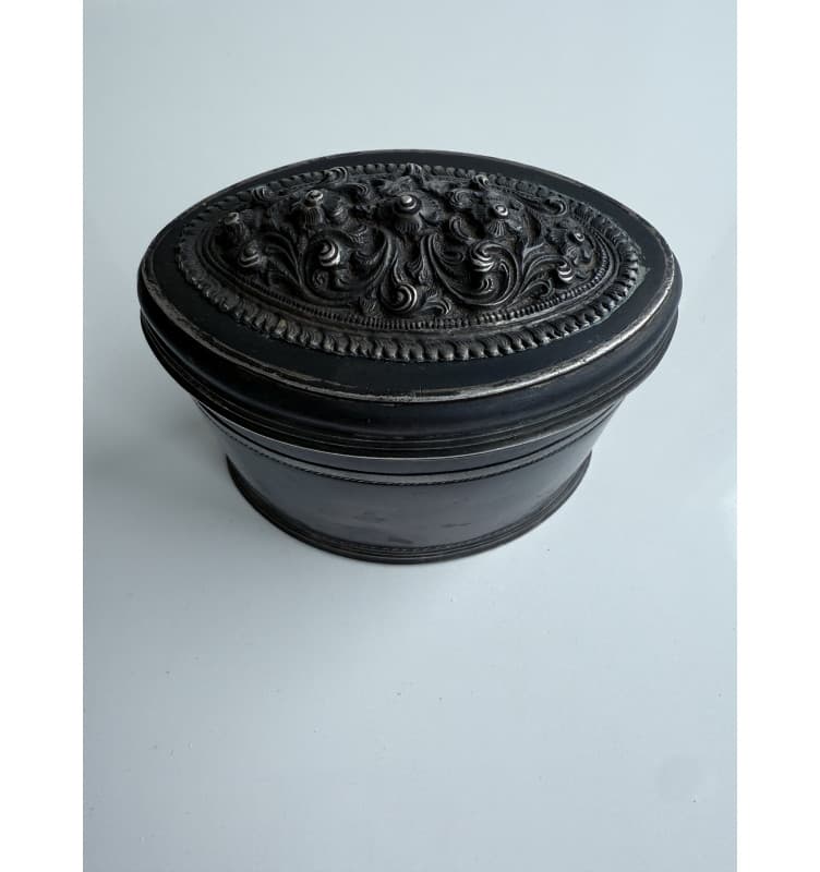 Größere einzigartige alte Kupferbox zur Aufbewahrung von zerstoßenem getrocknetem Limetten. Reste von getrocknetem Limetten innen. Schöne dunkle Patina. In einem sehr guten Zustand. Gewicht 186 Gramm.