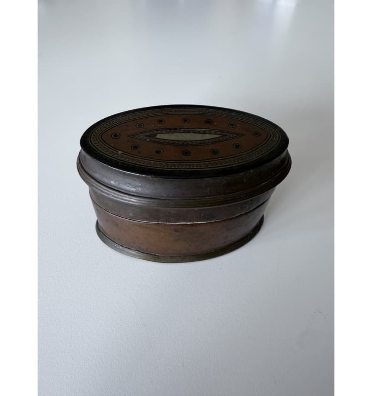 Ältere Kupferdose zur Aufbewahrung von zerkleinertem getrocknetem Kalk. Einlage und Muster auf dem Deckel, blanke Seiten aus reinem Kupfer. Reste von getrocknetem Kalk im Inneren. Eine Inschrift ist auf der Unterseite eingraviert. Im Vergleich zum Alter befindet sie sich in einem guten Zustand ohne Löcher und Reparaturen. Gewicht 174 Gramm.