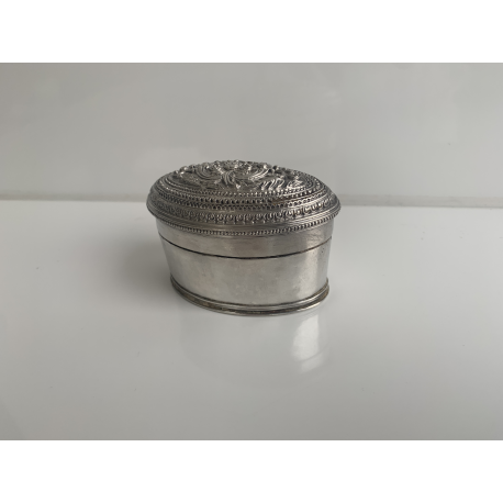 Ovale Silber-Limettenbox mit Blumendekor auf dem Deckel. Glatte Seiten. In sehr gutem Zustand. Gewicht 86 Gramm.