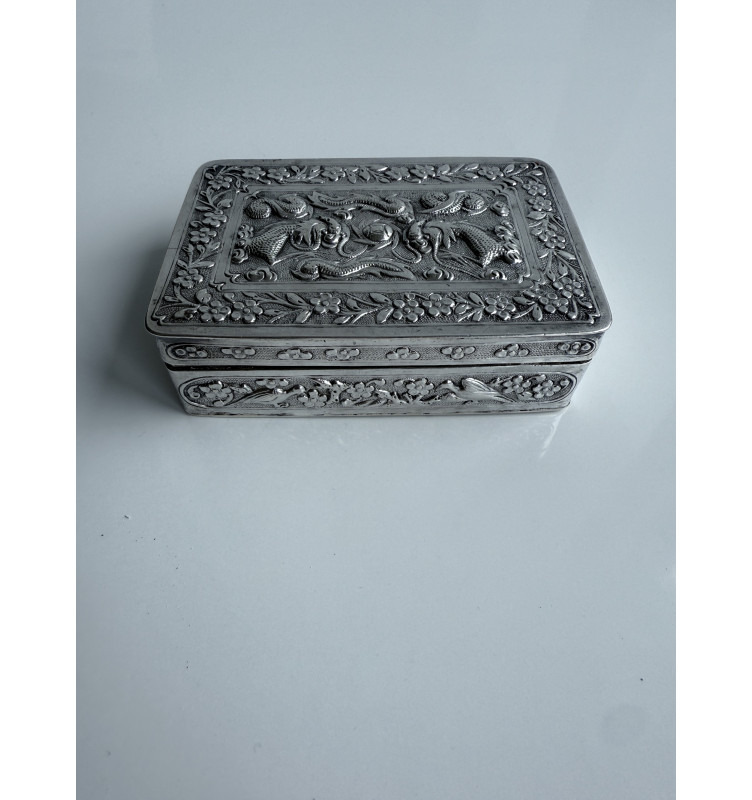 Schöne Silberdose mit durchbrochenen Drachen und Vögeln oben und an den Seiten. Überall detailliert mit Zweigen und Blättern verziert. Inschriften sind in die Unterseite der Dose eingraviert. In sehr gutem Zustand. Gewicht 145 Gramm.