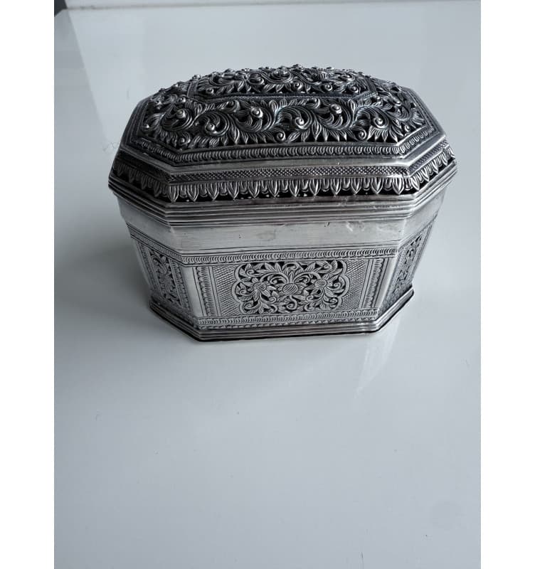 Achteckige durchbrochene Silberdose mit Blumenmotiv auf dem Deckel und den Seiten. In sehr gutem Zustand. Wirklich ein Meisterwerk der Präzision. Gewicht 120 Gramm.