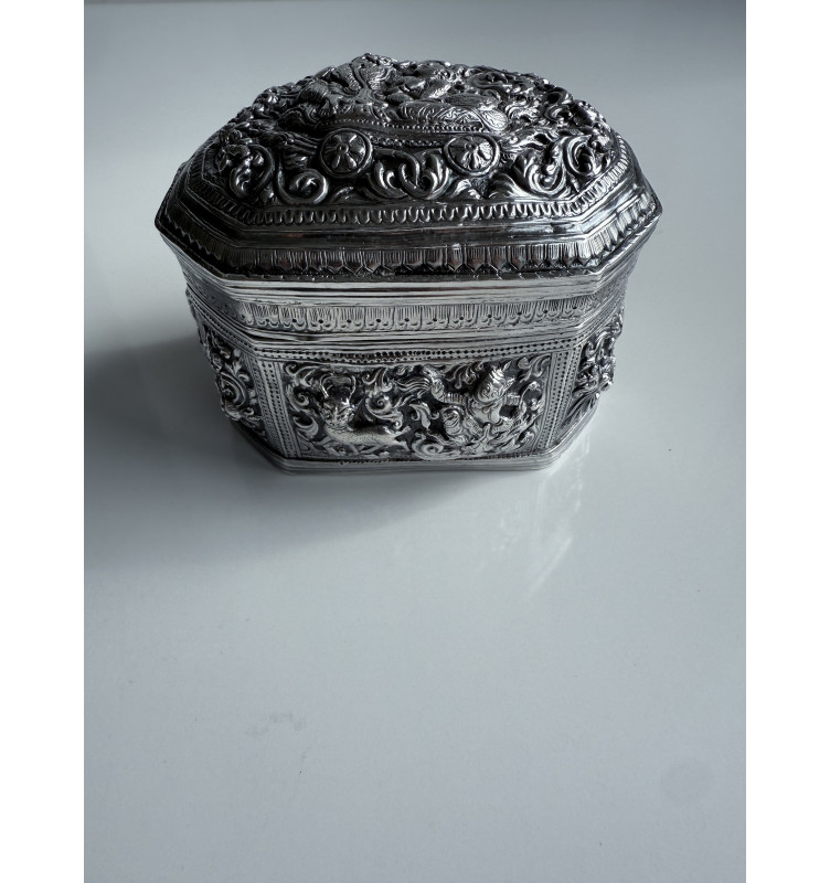Sehr seltene und reich verzierte Silberdose mit 2 Personen auf dem Deckel, umgeben von einem Blättermuster. Fabeltiere, Menschen und Blumen an den Seiten. In einem guten Zustand mit einer älteren Reparatur. Gewicht 120 Gramm. Einige Markierungen und Inschriften sind auf der Unterseite zu sehen.