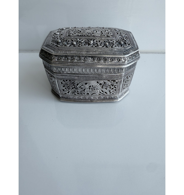 Achteckige durchbrochene Silberdose mit einem Drachen auf dem durchbrochenen Deckel. An den Seiten sind 2 Fabeltiere und viele detaillierte Blumenmuster zu sehen. Sehr präzise Verarbeitung. In sehr gutem Zustand. Wirklich ein Meisterwerk der Präzision. Gewicht 116 Gramm.