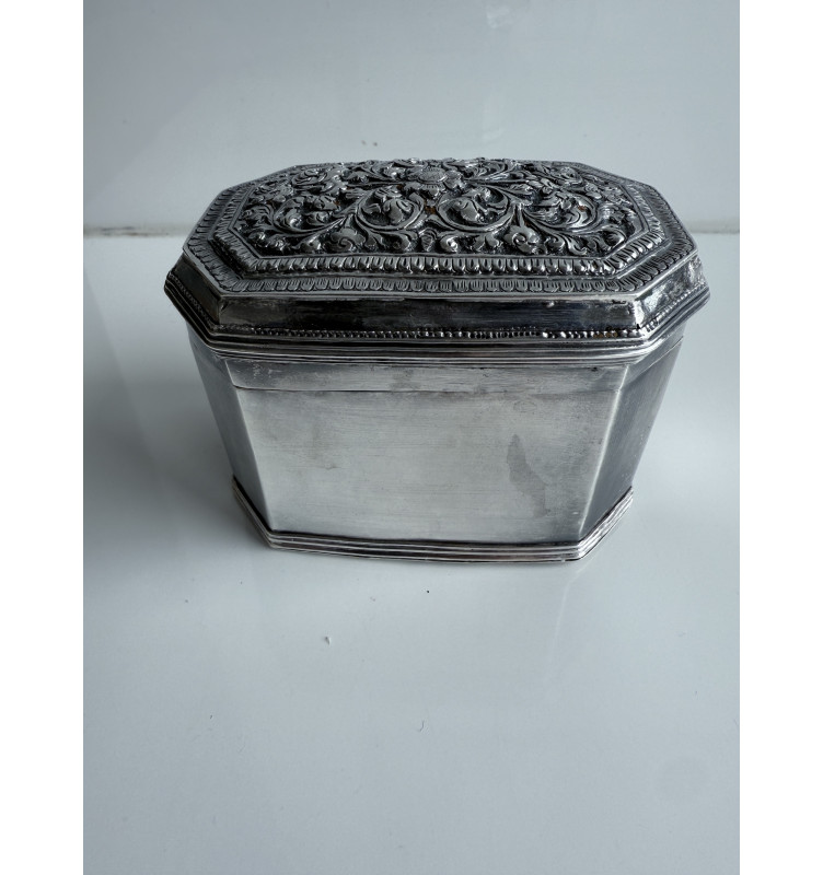 Ältere achteckige Silberdose, verziert mit einem schönen symmetrischen Blatt-/Zweig-Muster auf dem Deckel. Glatte Seiten und Boden. In gutem Zustand. Gewicht 160 Gramm.
