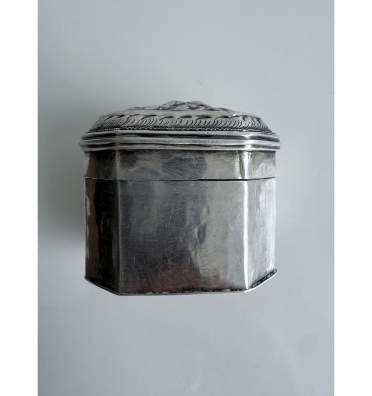 Achteckige Silberdose mit einem Tier auf dem Deckel verziert. Glatte Seiten. In gutem Zustand. Eine kleine Markierung ist auf der Unterseite eingraviert. Gewicht 62 Gramm.