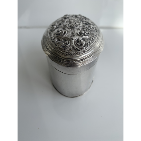 Größere silberne Limettenbox mit Blumenmotiv auf dem Deckel und blanken Seiten. Einige fast unsichtbare Markierungen am Boden. Gewicht 120 Gramm.