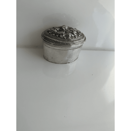 Kleine massive ovale silberne Limettenbox mit einem Vogel auf dem Deckel. Leere Seiten. Kleinere Dellen und Markierungen. Gewicht 43 Gramm.