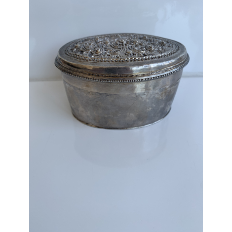 Ovale Silber-Limettenbox, dekoriert mit einem sehr detaillierten Blumenmotiv auf dem sehr flachen Deckel. Leere Seiten. Gewicht 145 Gramm.
