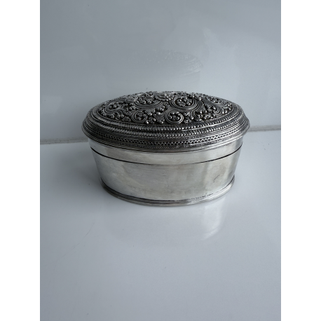 Große silberne Schachtel, verziert mit einem sehr präzisen, detaillierten Blumenmotiv auf dem Deckel. Leere Seiten. Längere Inschrift auf der Unterseite. Gewicht 190 Gramm.