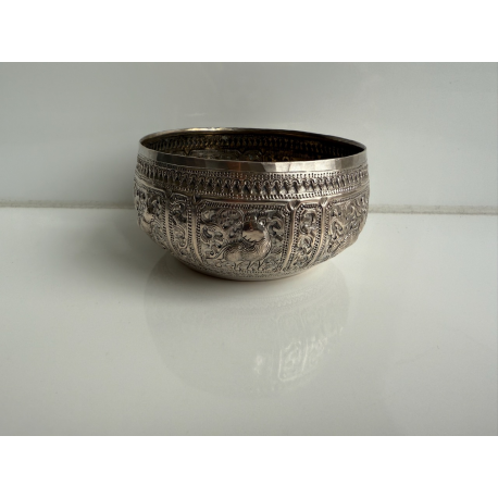 Niedrige Schale mit seltenen, seltsamen Tieren an den Seiten. Eine Inschrift ist in die Unterseite der Schale eingraviert. In gutem Zustand. Gewicht 73 Gramm.