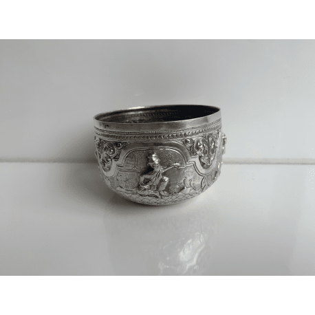 Kleinere Schale verziert mit 4 Figuren im Relief mit getriebenem Hintergrund. In einem guten Zustand. Gewicht 83 Gramm.