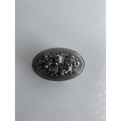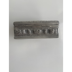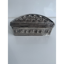 1.280,00 krRare half moon silver box. All around a floral pattern. On the bottom an inscription. Weight 125gram.