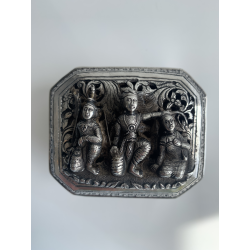 2.240,00 krOctagonal silver box with 3 royal persons on the pierced lid in high relief. Very detailed. In a very good condition. Weight 258 gram.