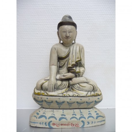 Sitzender Mandalay Kalkstein-Buddha auf einem Thron mit Inschriften.