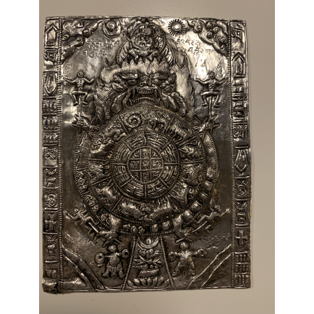 Ein silberner Teller mit Tierkreisfiguren in der Mitte, umgeben von Maudgalyayana, der seltsame menschenähnliche Figuren in seinen Händen hält. Auch mit Inschriften verziert. Das Rad des Lebens.
