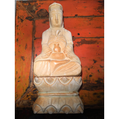 Fein sitzender Buddha aus Marmor mit rötlicher Patina. Auf einem Lotusthron. In sehr gutem Zustand, hält eine große Blume.