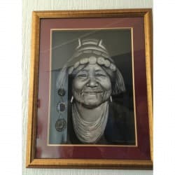 1.200,00 krEine ältere Frau aus einem Dorf in Burma, hinter Glas, in einem hölzernen vergoldeten Rahmen. Signiert.