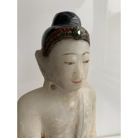 Sitting relaxed Mandalay Buddha. In a good size, fit in everywhere. The face is particular nice with stone inlay in the hairband.