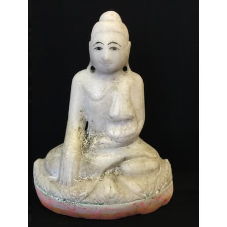 Simple and authentic Mandalay Buddha in alabaster from Burma (Myanmar), dating to the 19th century. The figure depicts a seated Buddha in classic style, placed on a decorative lotus throne.