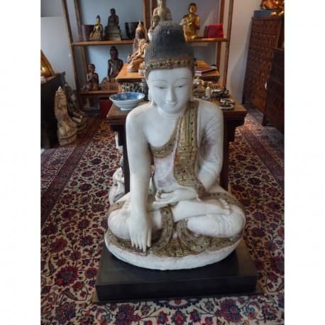Exceptional and impressive Mandalay Buddha in alabaster from Burma (Myanmar), dating to the mid-19th century. This monumental seated Buddha retains its original color and decorative stone inlays, making it a truly unique collector’s piece.