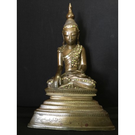 Beautiful and extreme rare sitting bronze Buddha from Burma. This classical Shan Buddha is sitting on a large Throne (with a very elaborate description all around) in a "calling the earth to witness" posture. His oval face has a serene expression, the hair is peppercorn styled and at the top rises the usnisa (flame) shaped as a stupa. The robe is simple, covering the left shoulder and the ears are going all the way down to the shoulders. You will see green and white stoneinlay in the hairband and on the robe, which is very unusual. The Buddha is in a excellent condition.