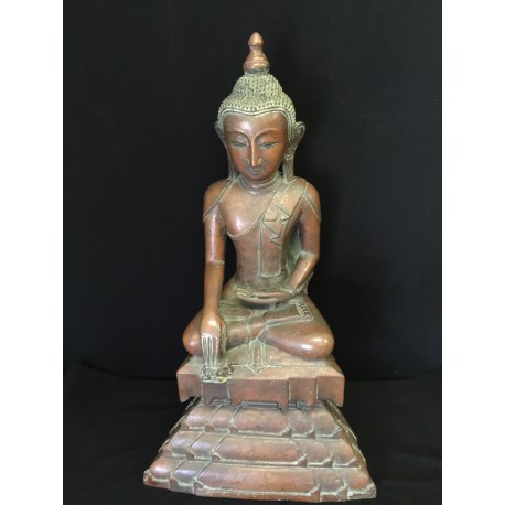 Larger, very rare and extremly beautiful sitting shan bronze Buddha from Burma. Also called Tai Yai. This Buddha is sitting on a very large throne in a calling Earth to witness posture. But his right hand fingers are resting on top of a small elephant. His oval face has a serene expression, the hair is peppercorn styled and at the top rises the usnisa (flame) shaped as a stupa. The robe is quit simple, covering both shoulders (normally the robe is only covering left shoulder), and the ears are going all the way down to the shoulders. The bronze is light brown with few dark greenish spots.. The Buddha is in a excellent condition. A collectors item.