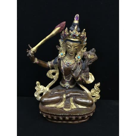 Mañjuśrī is depicted as a male bodhisattva wielding a flaming sword in his right hand, representing the realization of transcendent wisdom which cuts down ignorance and duality. This Buddha is quit rare, as it is decorated with stones and coral. On a lotus throne with handpainted face. In mint condition.