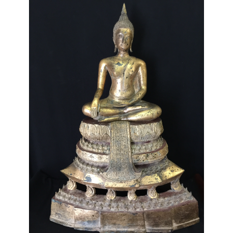 Nice Bangkok sitting Buddha. On a very large and decorated throne. This throne is quit unusual as it is pierced. Made in bronze, then lacquered, gilted often with gold leaf applied. The Buddha is sitting in calling Earth to witness posture. In a very good condition. The Buddha is 38 cm high.