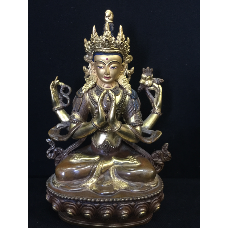 High end and very nice sitting crowned Kharachheri also called Bodhisatwa Avalokiteswara. Always decks with all sorts of ornaments. 4 armed carrying rosary in the right hand and full blown lotus in left. On a lotus throne with handpainted face. In mint condition. Bottom closed by a copper plate with a mark. 1,55 kg.