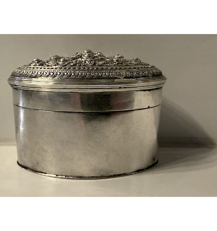 Large silver box decorated with a very precise detailed flower motive on the lid. Blank sides and a longer inscription on the underside of the box. Weight 88 gram..
