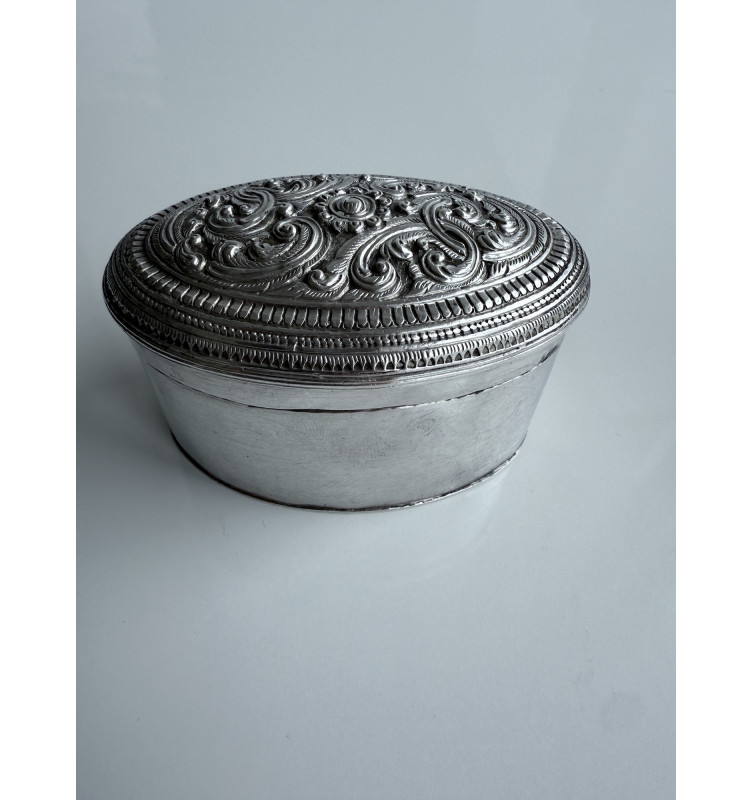 Smaller oval silver box with a beautiful floral pattern on the lid. Plain sides and in a very good condition. 4 marks are chased into the underside. Weight 82 gram.