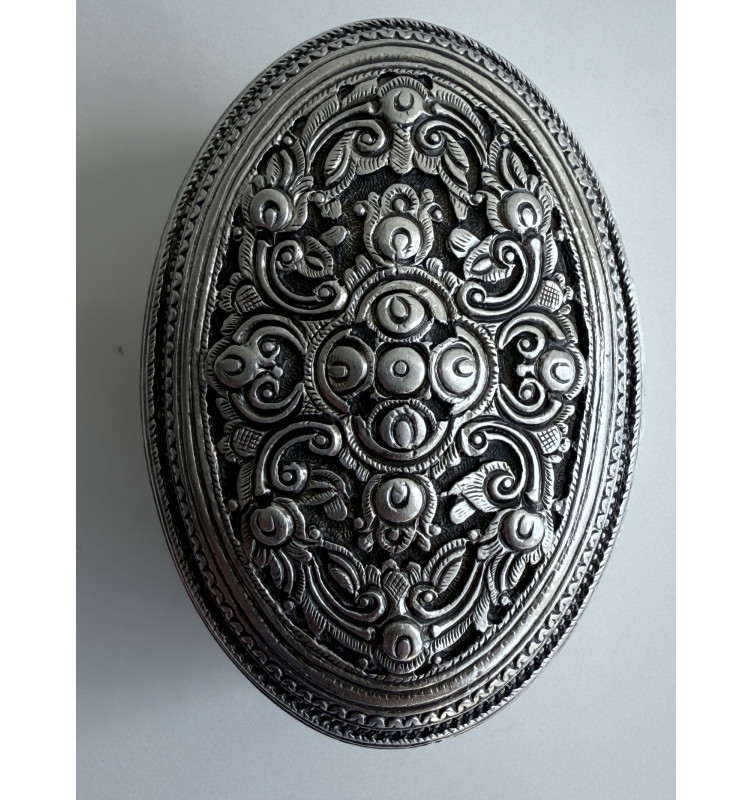 Smaller oval silver limebox with a very nice flower pattern on the lid. Plain sides and bottom. Weight 65 gram.